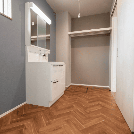 足元はヘリンボーンで個性的に。機能とデザインが調和した、自慢の洗面空間。