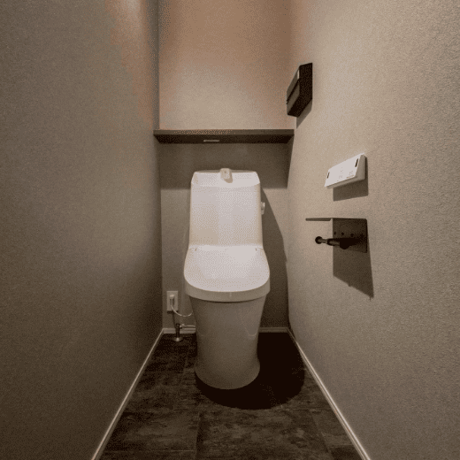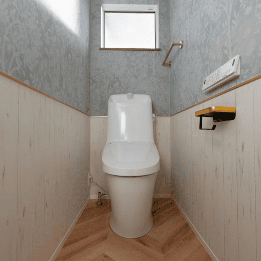 落ち着いた色味のクロスと床材。清潔感と居心地の良さを両立したトイレ。