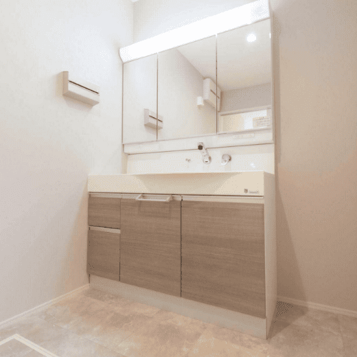 収納力のある三面鏡でスッキリ整う。木目調で統一したナチュラルな洗面。