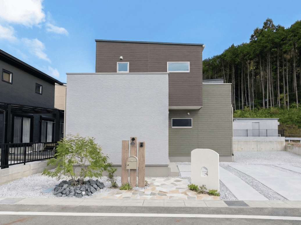 コンセプトは「大人かわいい、ナチュラルモダンな箱の家」。 3色の張り分けと自然素材が調和するスクエアな外観が、訪れる人を温かく迎えます。 室内は、木の温もりと3連ライトが彩るカフェ風のダイニング。ヘリンボーン床の洗面室や、ゴールドを効かせたシャビーシックなトイレなど、空間ごとに異なる「ときめき」を散りばめました。 極め付けは、セレクトショップを思わせるディスプレイ収納。デザインも暮らしやすさも諦めない、こだわりと感性が隅々まで詰まった家。