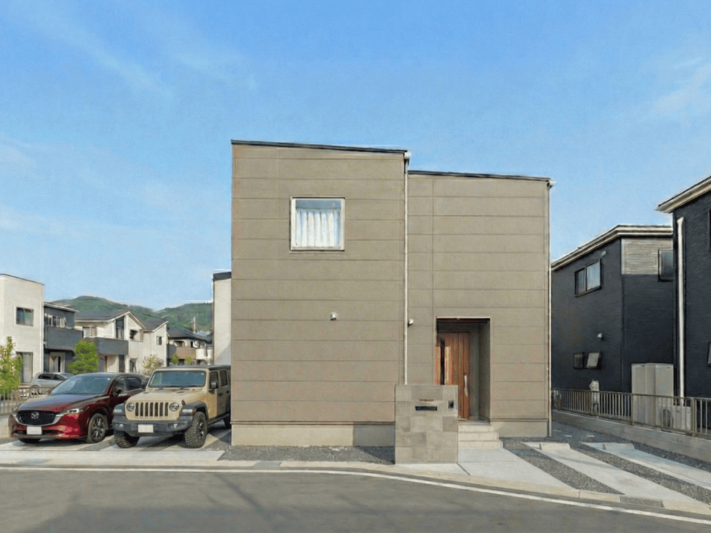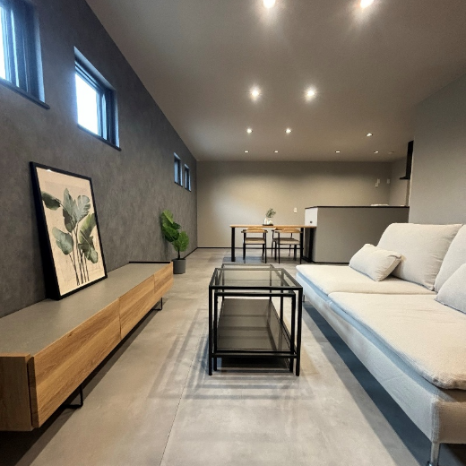 「家は、暮らす器」。ケミューの外壁が描くグレージュと黒のスクエアな外観は、光と影を纏い、静かで芯のある佇まいを見せます。 室内は、グレーの質感と木の温もりが調和する洗練された空間。間接照明が優しく迎える玄関、ホテルライクな浮遊感のある造作洗面台、そして使い方を限定しない多目的なワークスペース。 美しさの中に、「暮らす」ための機能を丁寧にデザインしました。ただの箱ではない、住まう人の美意識と心地よい時間を紡ぎ出す、感性を満たす一棟です。