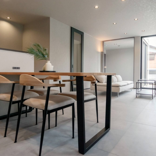 玄関の扉を開けた瞬間、視線を奪うのは美術館のような美しいアイアン階段。LDKへ進むと、全面グレータイルの床が広がり、洗練された非日常感を演出します。